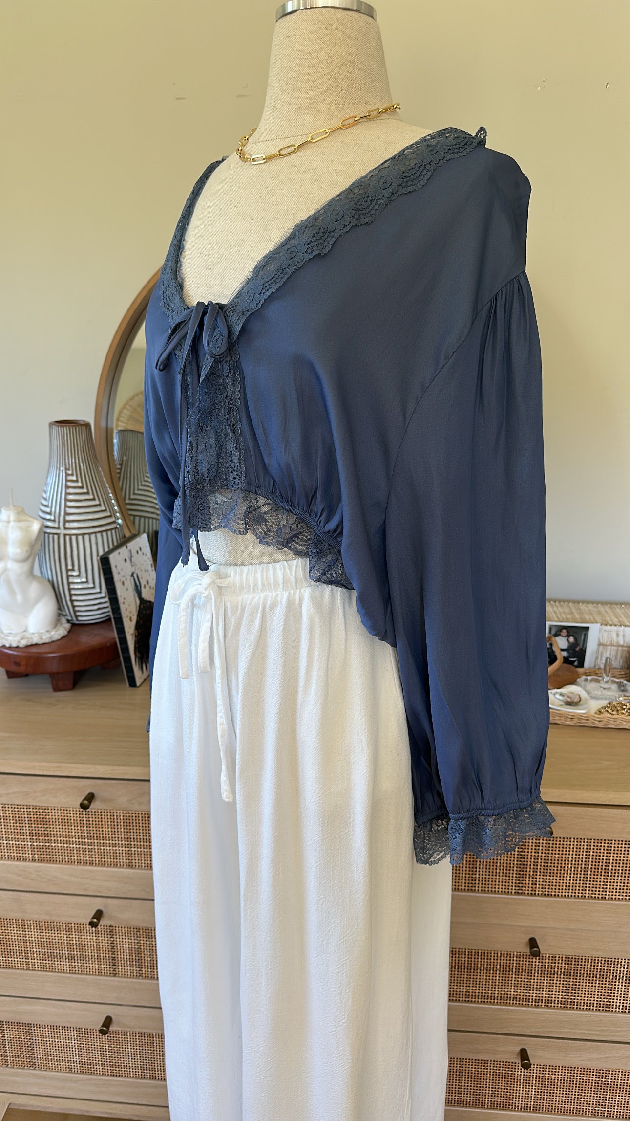 Lone sleeve, satin crop top. Front ties with buttons.