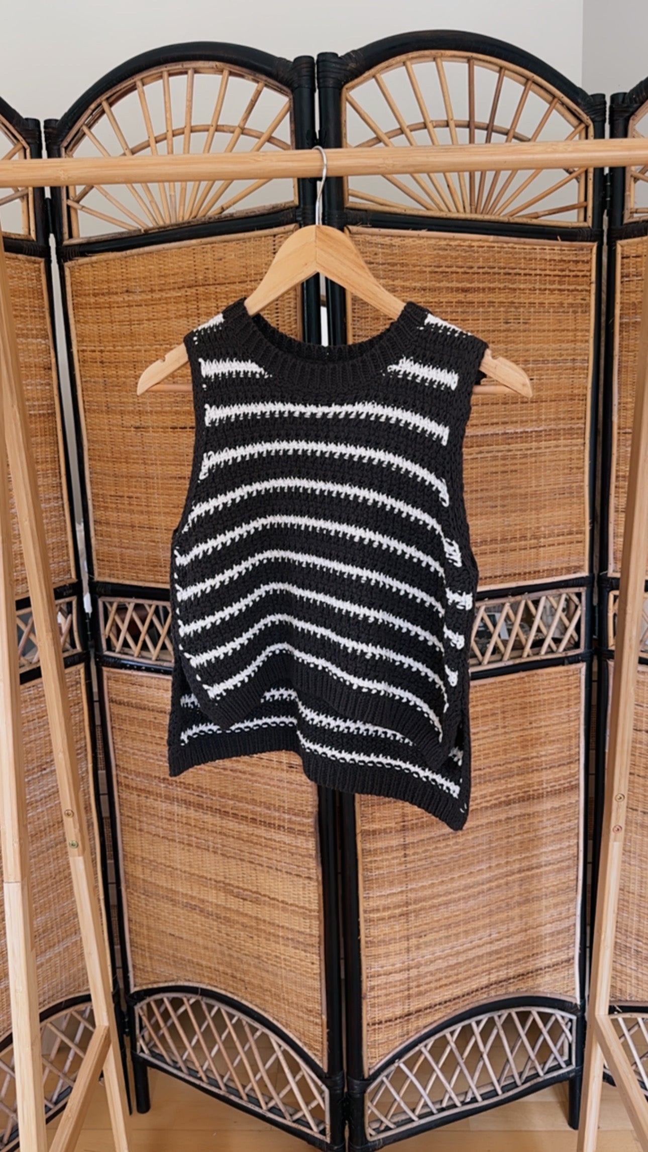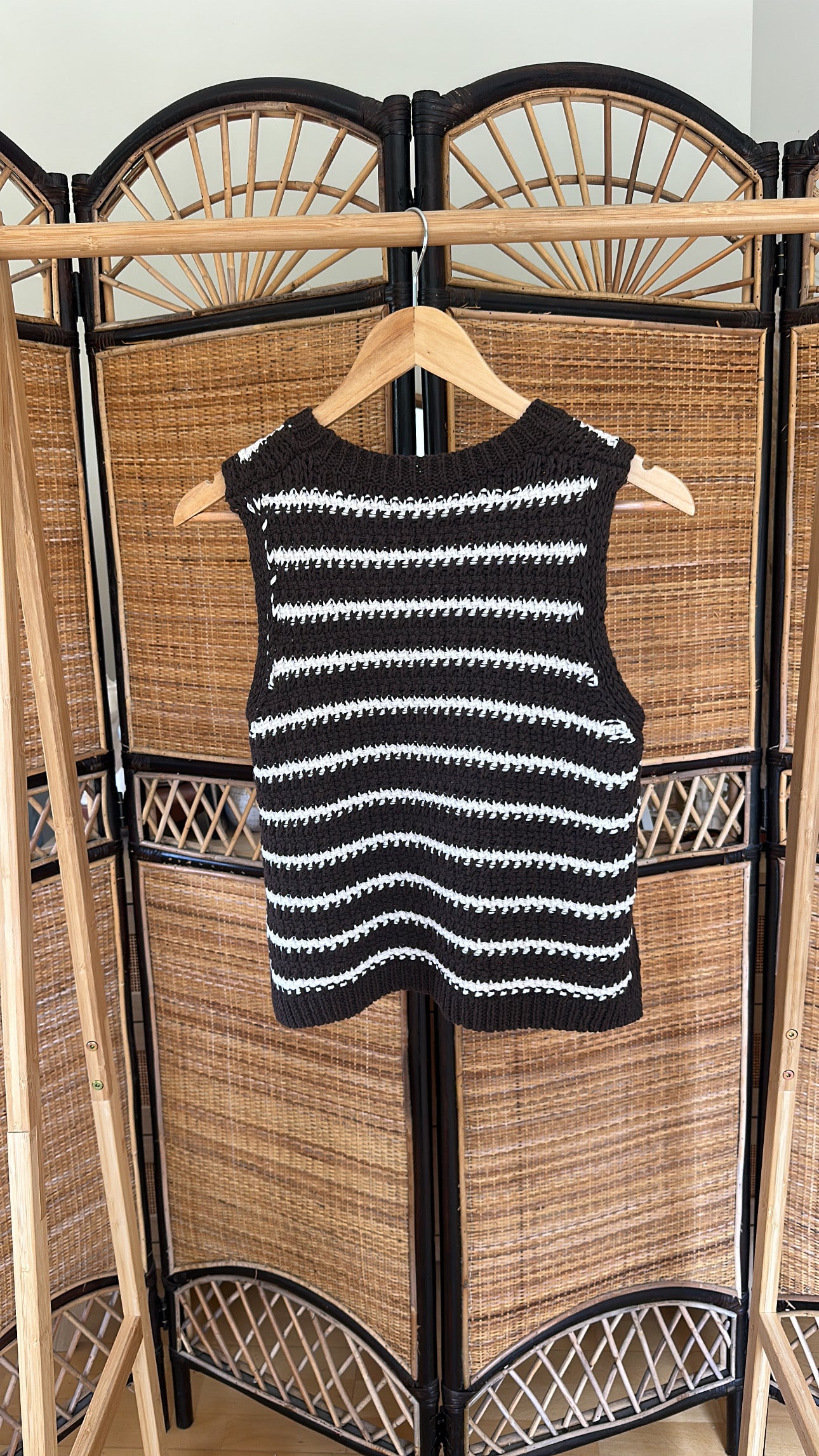 Dark brown sweater vest with an ivory stripe. Has some stretch.