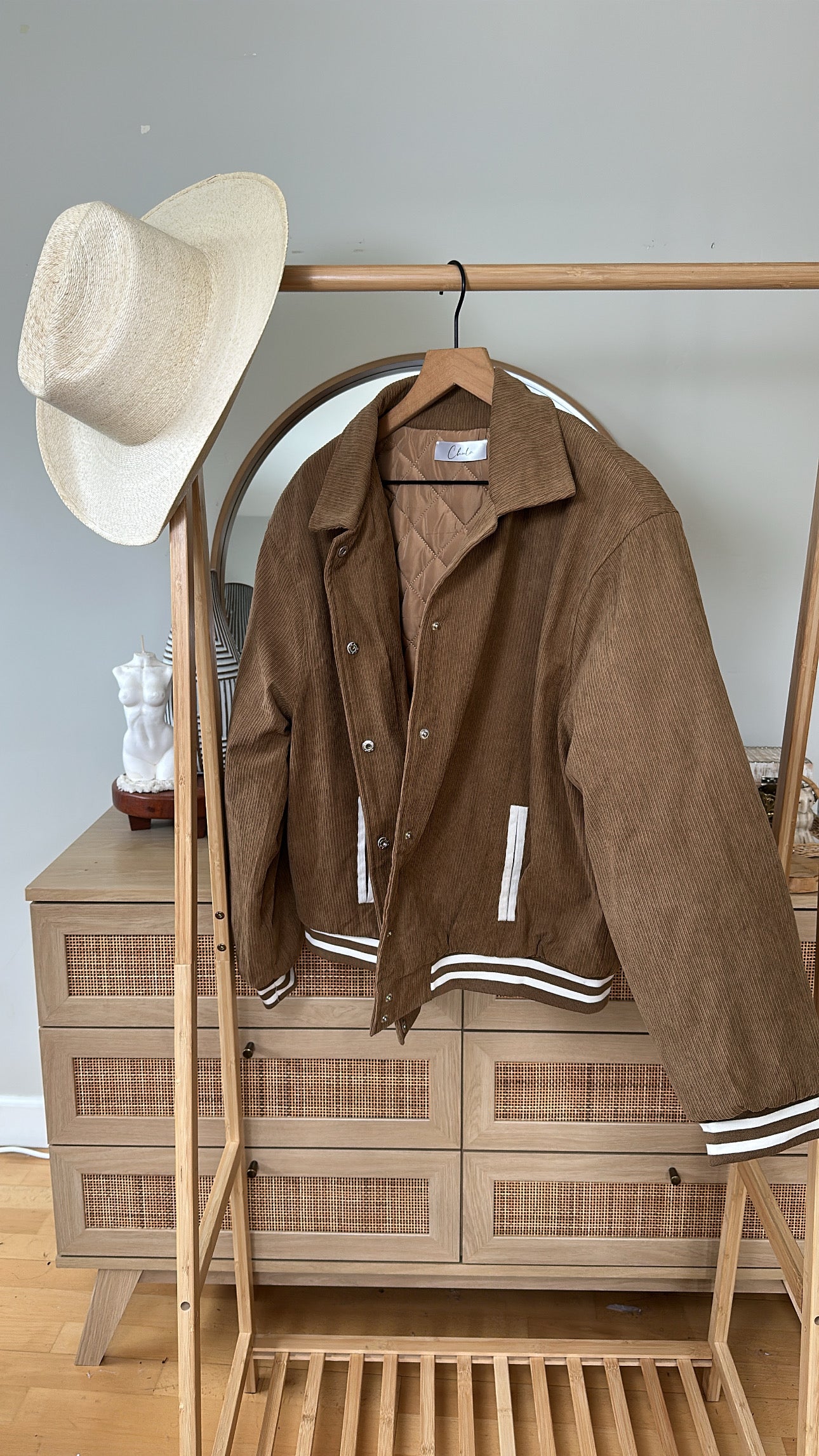 An oversized boyfriend inspired jacket. She is thick and a soft. Very warm. Corduroy feel of material. Two front pockets.