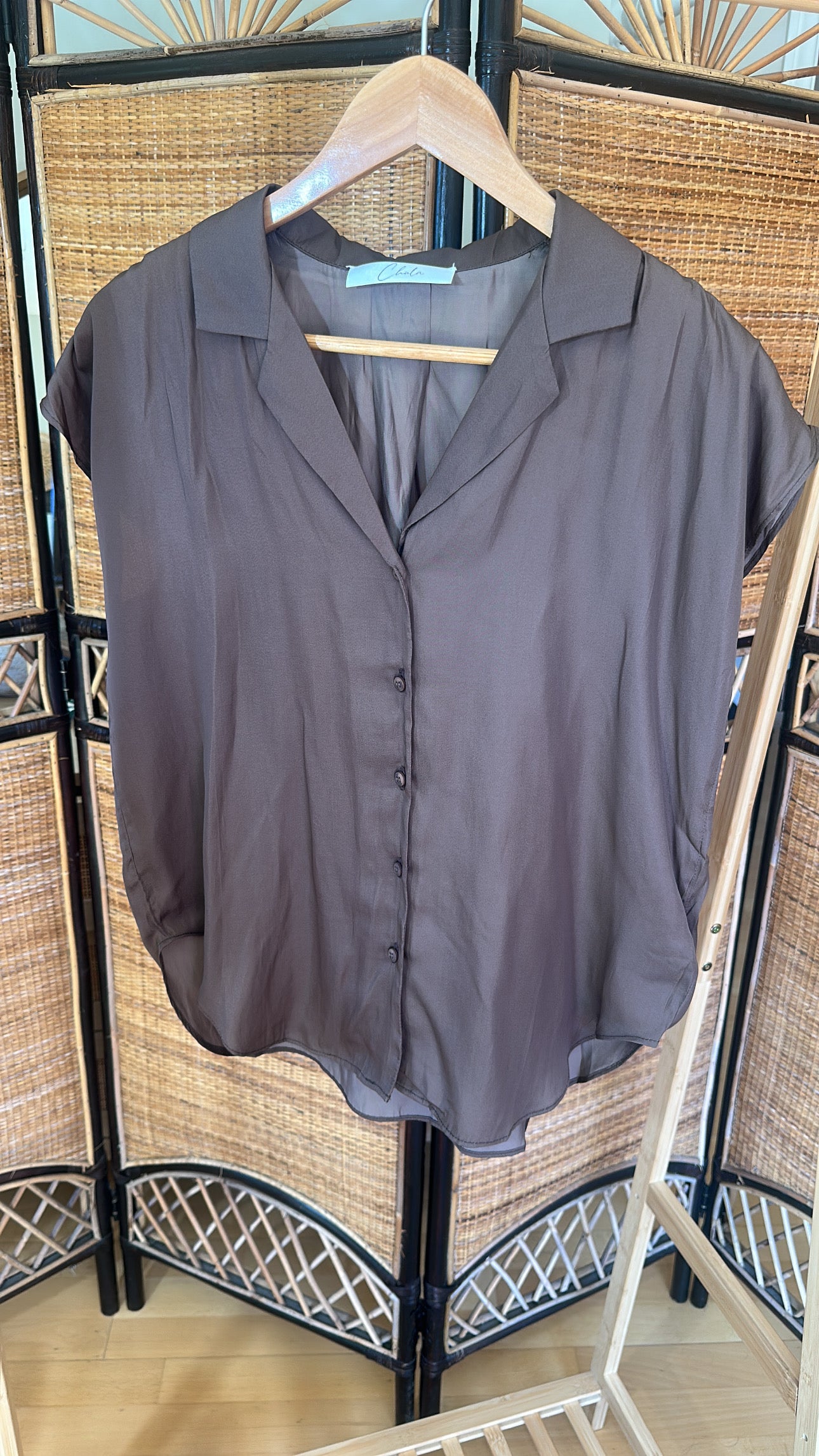 A satin button up top, slightly fitted. In the color a burgundy brown.
